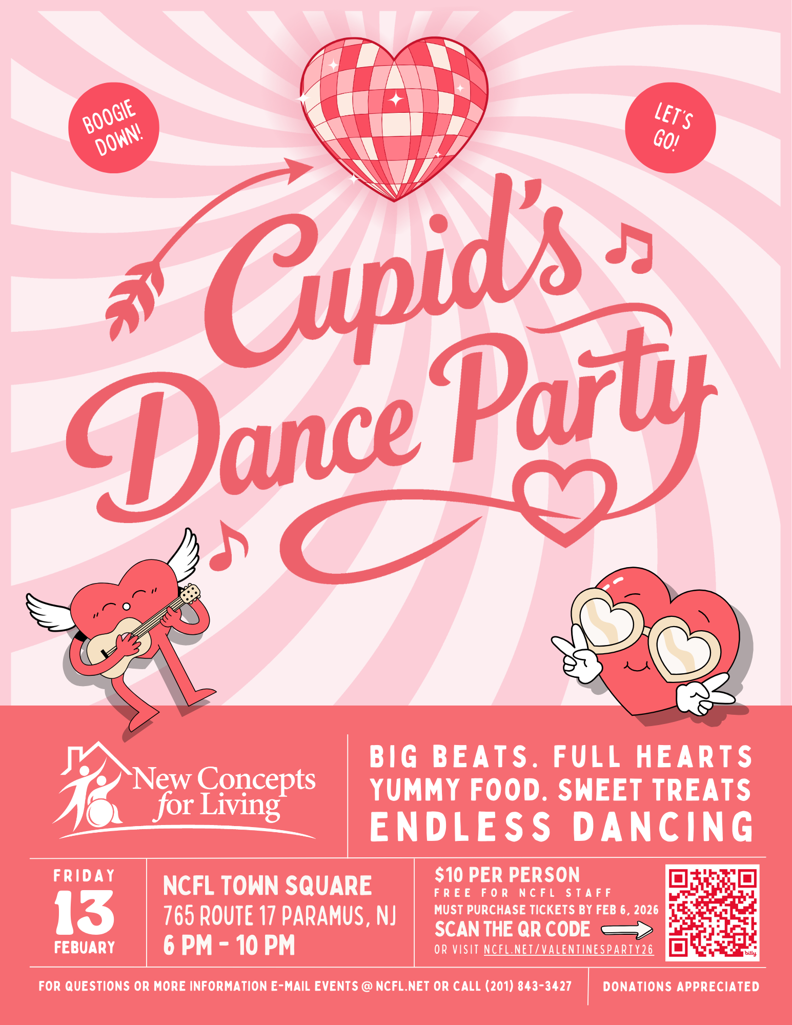 You’re invited to Cupid’s Dance Party Join us for a celebration filled with great music, dancing, delicious food, and lots of smiles. Come ready to dance and celebrate with NCFL family and friends.